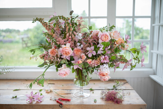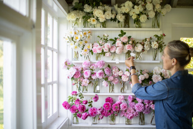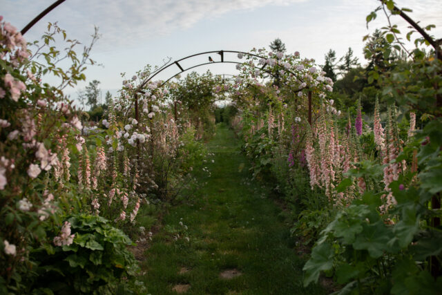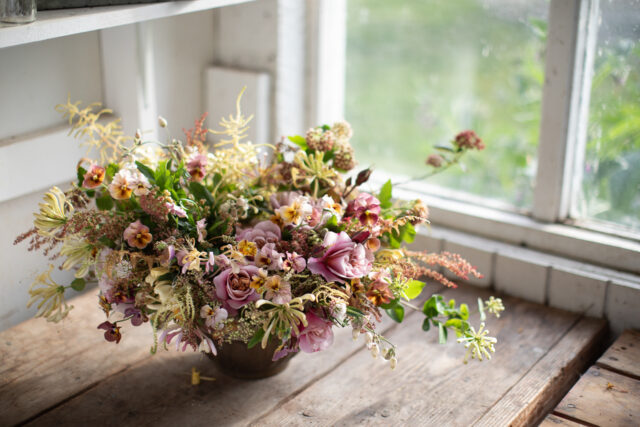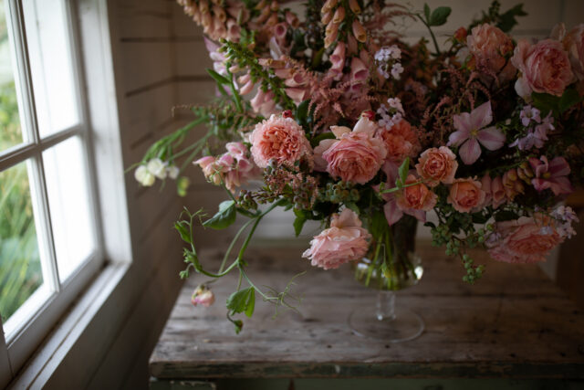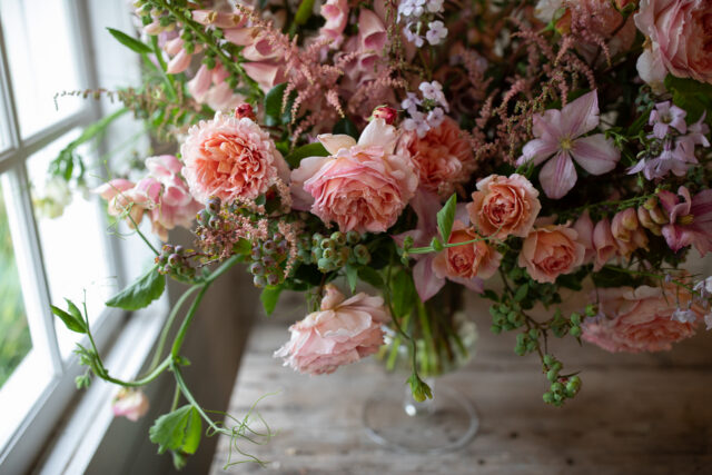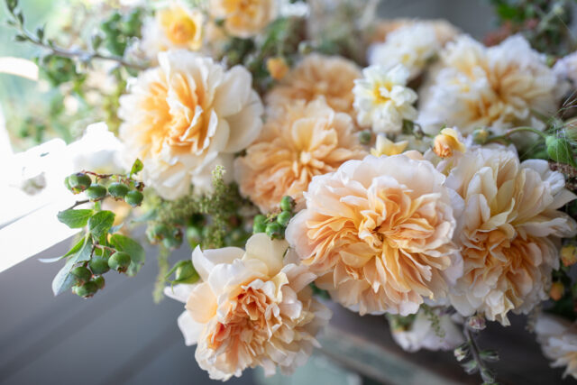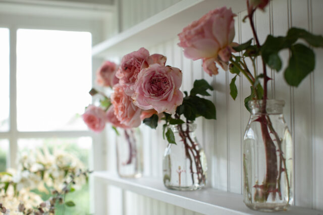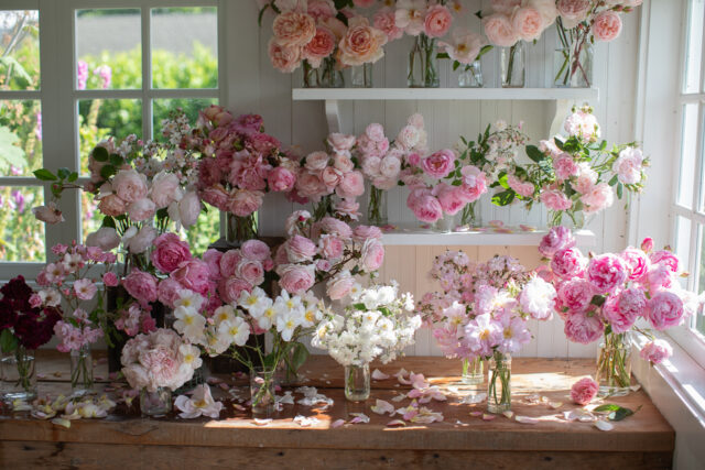 In addition to growing hundreds of rare, rambling, and species roses, we also have quite a collection of English roses bred by David Austin. These varieties are some of my absolute favorites for cutting because they have the look and feel of an old rose, but bloom all season long. My favorite thing to do each June is to make a rainbow shelf and squeeze as many varieties onto it as I can.