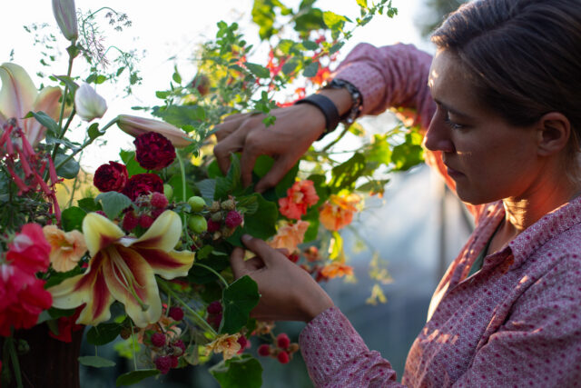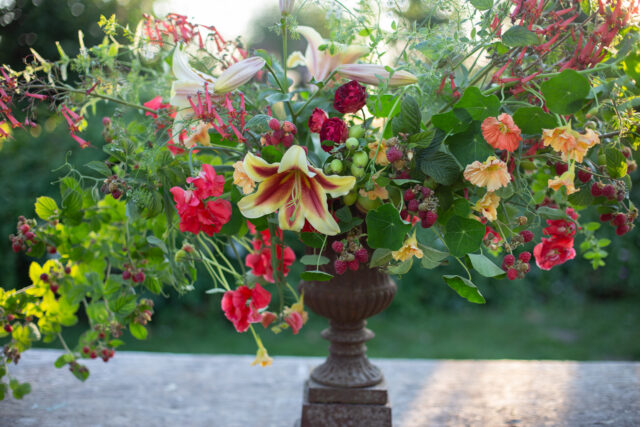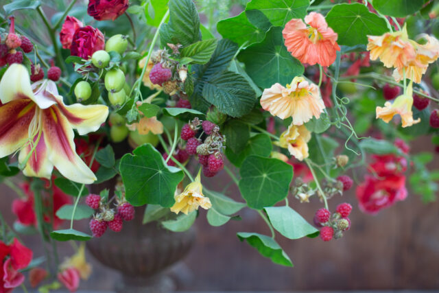 I highly encourage you to grow some edibles alongside your cut flowers. They are not only beautiful for arrangements, but also wonderful for eating. Many edible varieties are easy to grow from seed, love the heat, and produce abundantly from summer through the first fall frost. They also produce wonderful foliage. Some of my favorite edibles for floral design include tomatoes, unripe berries and fruit, such as blueberries and raspberries, and herbs, such as basil, dill, and oregano. If you want to read all about my favorite edibles for floral design, read this blog post.