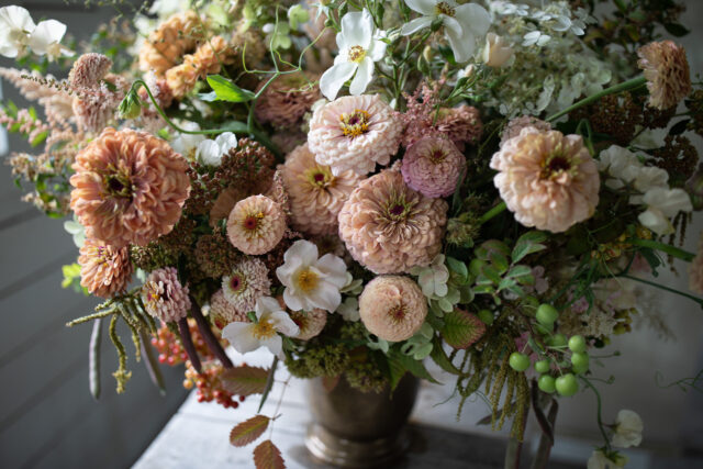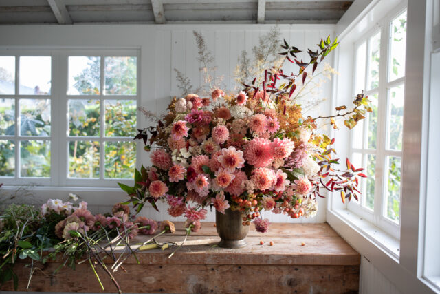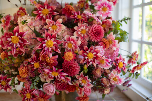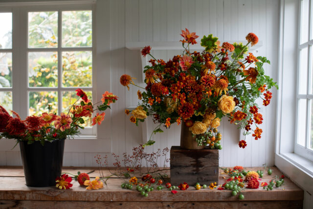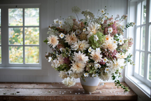 As the days grow shorter, many of the enormous dinner plate varieties start to produce slightly smaller flowers, and their centers start to pop open. I love threading some of these open-centered blooms into a grand arrangement to give it a more casual, wildflower-like feel. My favorite way to arrange bigger blooms is en masse because then they don’t outshine the other flowers.