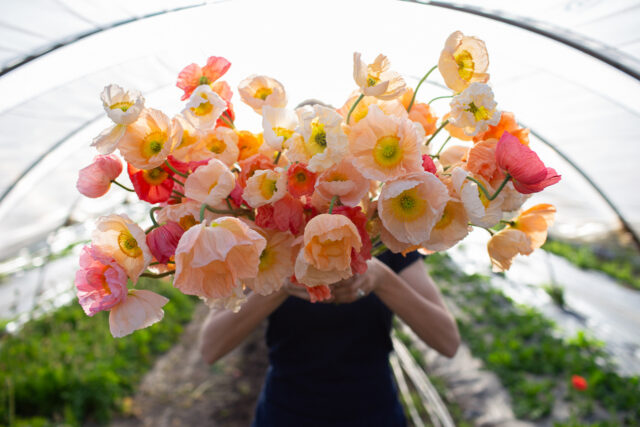 One of the most exquisite cut flowers I’ve ever grown, Iceland poppies have been a spring staple since the early years of Floret. Their tissue paper–like blooms and beautifully colored petals, paired with their fresh citrusy scent and abundant flowering habit, make them highly prized cutting garden additions. While Iceland poppies are technically perennials and can survive even the coldest winters, I’ve always grown them as hardy annuals and plant seedlings either in autumn or in late winter inside an unheated hoop house to get the earliest blooms.