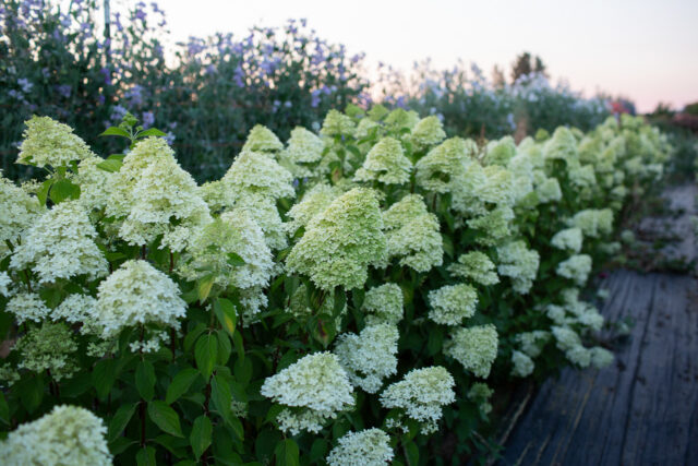 The best part is that they bloom on new wood, so you can’t accidentally prune them incorrectly. In late winter, we cut our plants down to about 2 ft tall; the amount of pruning you do will depend on how large you want the flowers to be. If you prune PeeGee hydrangeas hard, the resulting flowers will be much larger; if you use a lighter touch, flowers will be smaller and more branching.