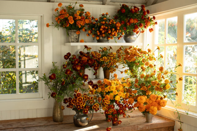 Each year as the garden starts to slide into autumn and the flowers become more tattered with every passing week, marigolds seem to come into their own and I am reminded why I love them so much. They are tough, easy to grow, thrive in the heat, pump out flowers from midsummer until the first fall frost, are nearly weatherproof, are ignored by almost all pests and diseases, and last an incredibly long time in the vase.