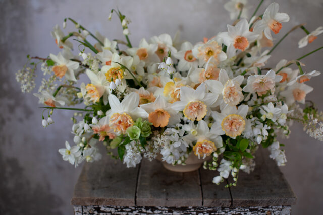 To do this, place freshly cut stems into cool water, on their own, for 2 to 3 hours. During that time, the stem ends will callous over and the sap will stop flowing. After that, they can be added to arrangements—just don’t recut the stems because they will start leaking again. If you’re arranging daffodils on their own, no special conditioning is required.