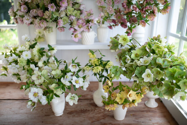 Hellebores have a reputation for not lasting well as cut flowers, but they actually make great cuts if you know when to pick them and how to condition them. It’s important to wait until flowers are on the more mature side, so hold off harvesting until all the little pollen florets encircling the center have dropped. If you can wait until the seedpods in the center start to form, they will last even longer.