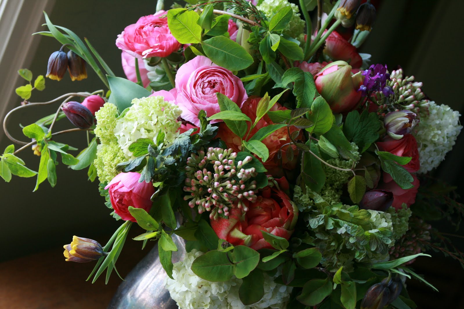 Snippets of Akebia and Honeysuckle vines, handfuls of glacus Thalictrum foliage, an armload of bush Honeysuckle and fragrant pink Viburnum buds….. pure bliss.