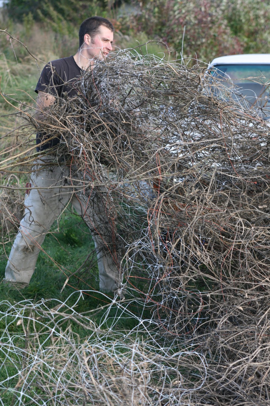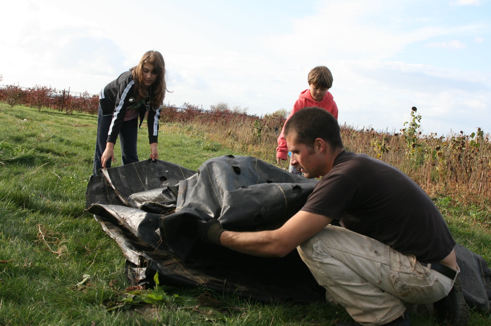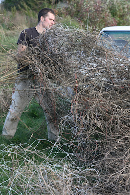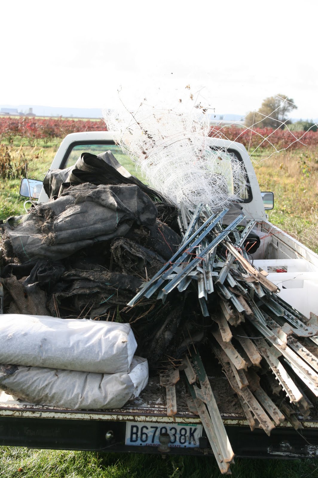 The first thing we had to do was pull out all of the drip irrigation,t-posts, netting and landscaped fabric. This is possibly the most hated job on the farm! I stomp and scowl through the entire process!