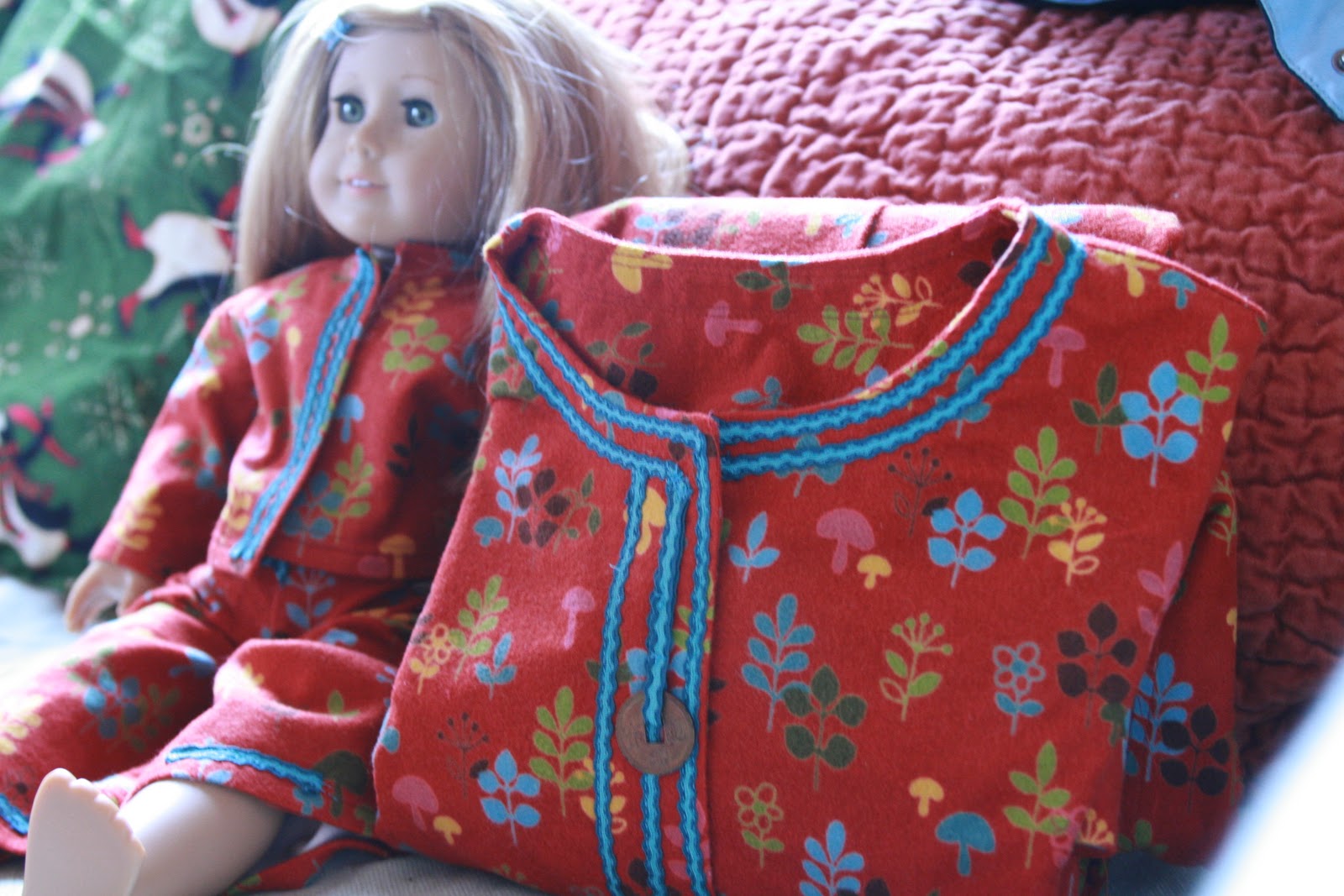 | Christmas jammies from Grandma with a matching set for the American Girl doll. |