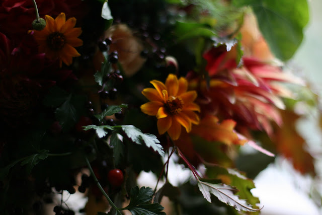 | Bouquet Includes: Rose Caramel Antique, Dahlias,Persian Carpet Zinnias,Crabapples, Rosehips,Raspberries,Grapes,Fennel,Scented Geraniums,Basil,Blackberries,Amur Maple Leaves,Black Elderberries and Peppermint.All ingredients, minus the garden roses from our garden :) |