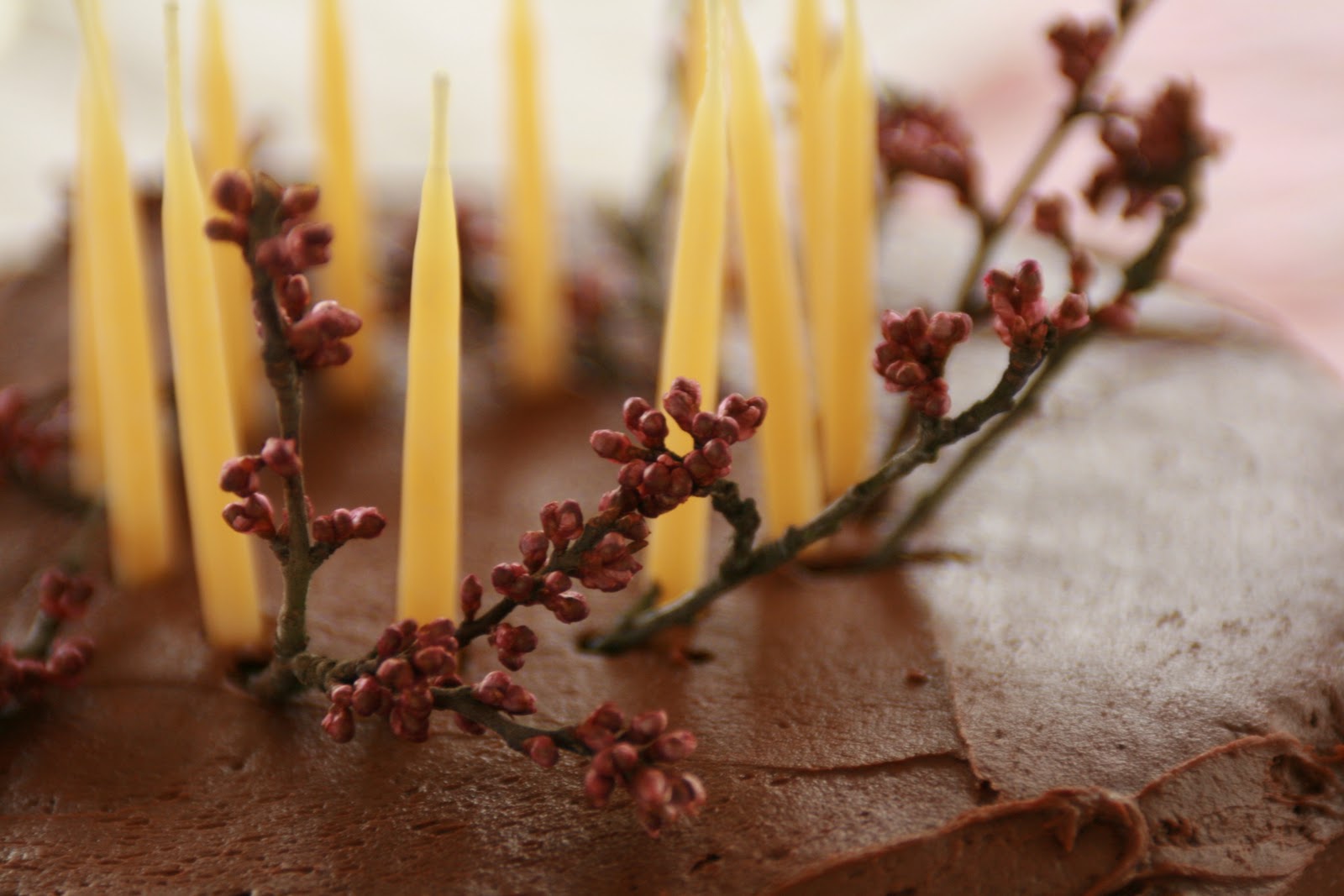 Am I seeing a devine vision… chocolate cake decorated with little plum branches, pussy-willows, and baby bees wax candles? It's just about the prettiest confection ever.