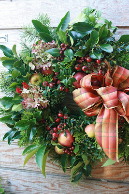 Below a table full of amazing ingredients : Mixed greens, dried scabiosa pods, peppers, dried wheat, crabapples /lady apples, rosehips, dried orange and apple slices, cinnamon sticks, kumquats and twigs.