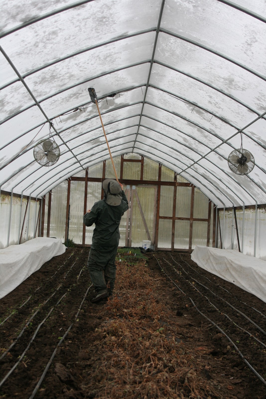 The roads were super slick this morning so Chris is home, keeping the greenhouses swept clean of heavy, wet snow.