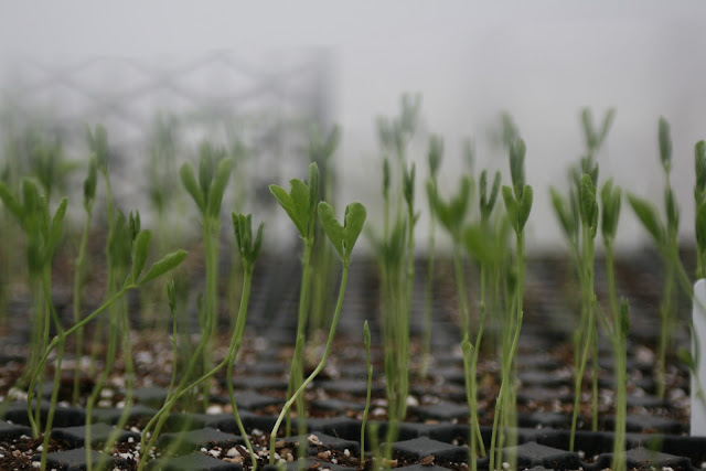 The baby seedlings are all snuggled up on their heat mats with layer of frost cloth keeping them toasty warm.