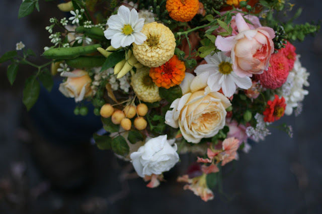 Includes: garden roses, zinnias, nasturtiums, seven sons flower, hydrangea, cosmos, celosia, sweet pea vines, gomphrena, scabiosa, atriplex, peppers, tomatoes, crabapples, fava beans, blackberries, dill, oregano flowers, savory and cilantro flowers.